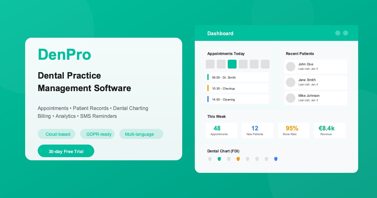DenPro is an all-in-one cloud-based dental practice management system available in 54 languages. It serves dental clinics from solo practices to 100-location chains across Europe, Asia, the Middle East, and Latin America. DenPro integrates directly with national health insurance systems in 7+ countries.